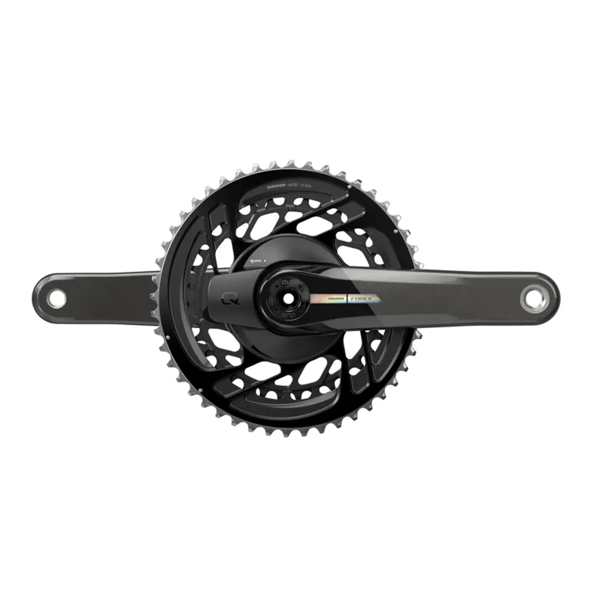 It looks like it’s from the future, but it’s here now. SRAM's lightest, stiffest, and most accurate integrated power meter and chainring combo is now on force. Quarq D-zero technology is accurate to +/-1.5% and isn’t affected by temperature changes, and the consistent 13-tooth gap on the rings ensures fast and reliable shifting. Not just unbeatable on performance, the integrated rings are also incredibly long-lasting. And let’s not be modest: the combination of these rings on this iridescent carbon crankarm is the best looking thing out there.